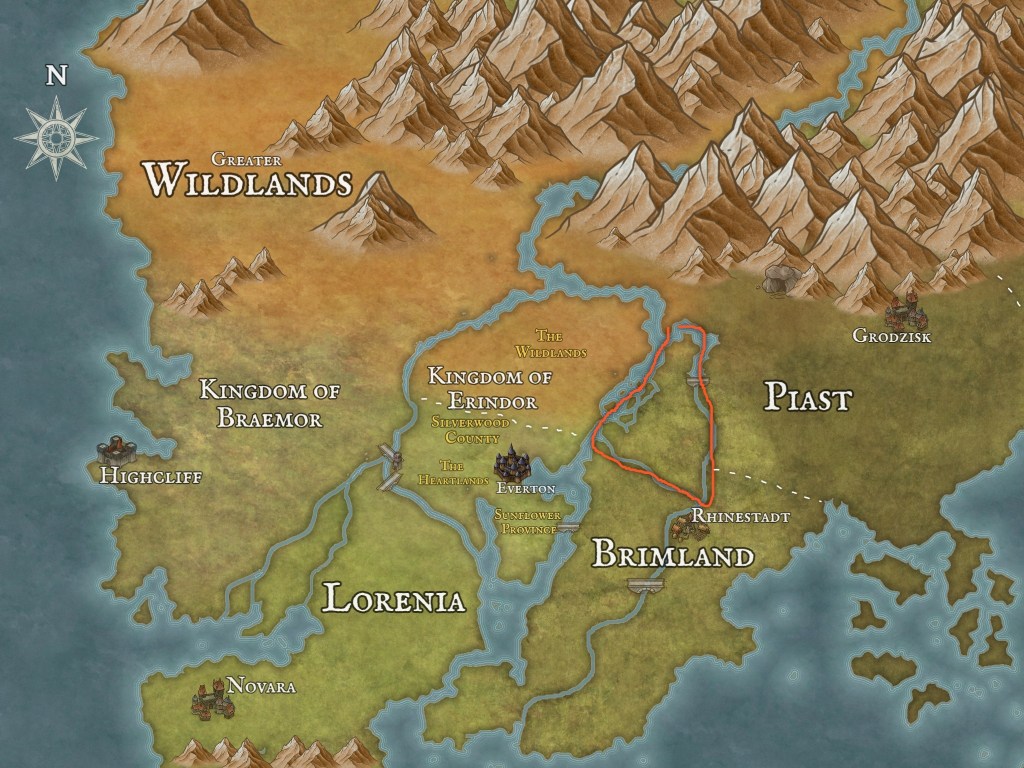Our next chapter of the story takes place in the western borderlands of Piast, the part of the country closest to the Kingdom of Erindor and also contested by Brimland to the south.