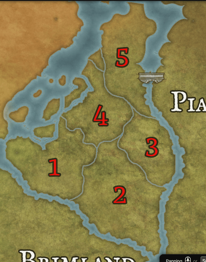 The region where this chapter takes place (1 on the map) is one of those five. It lies on the western side of Piast, close to the Kingdom of Erindor and under pressure from both outside claims and internal conflict. While Piast officially controls the area, local power is mostly in the hands of a cruel warlord and regional rulers.